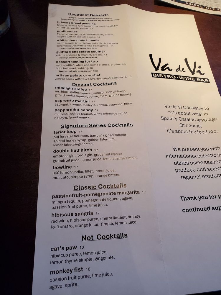 Va de Vi Bistro & Wine Bar in Walnut Creek, CA offers a delightful dining experience with small plates and an extensive wine selection. The bistro provides a cozy and intimate setting perfect for catching up with friends or enjoying a romantic date night. Customers rave about the exceptional service and diverse menu options, including favorites like the brioche bread pudding and va de vi burger. The atmosphere is classy yet fun, making it a favorite spot for Mussels, Sangria, and cod fish ceviche. The food is consistently delicious and served piping hot, with standouts like the pancetta-wrapped prawns and crispy brussel sprouts. The wine selection is extensive, with sampler flights available for those looking to try multiple options. Va de Vi Bistro & Wine Bar is a must-visit for those seeking a high-quality dining experience with a range of options to satisfy any palate.